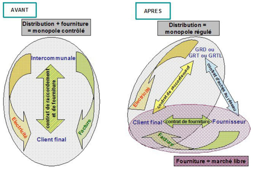 Avant la libéralisation, les intercommunales assuraient la distribution et la vente d’électricité et de gaz aux consommateurs (particuliers et entreprises) sur leur territoire. Tout client raccordé au réseau de distribution d’électricité ou de gaz n’avait pas d’autre choix que de se fournir en énergie auprès de son distributeur.
